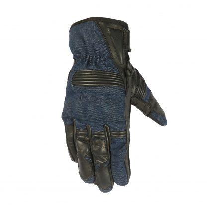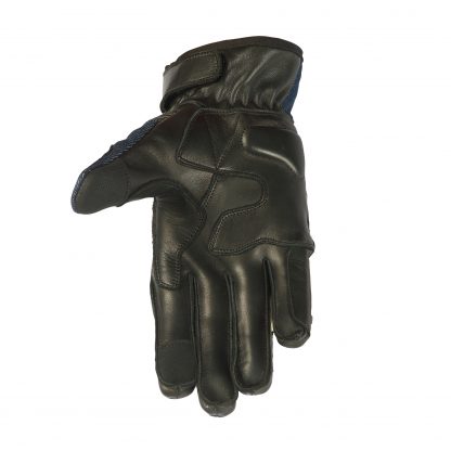 Short racing gloves with nice fit. Soft & supple leather with denim jean as outer shell. Laminated knuckle with denim fabric. Leather stretch panels at fingers, thumb & under knuckle. Leather re-enforcement at palm area for double protection. Touch fabric at first finger & thumb.